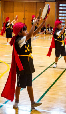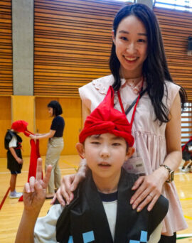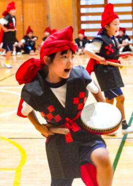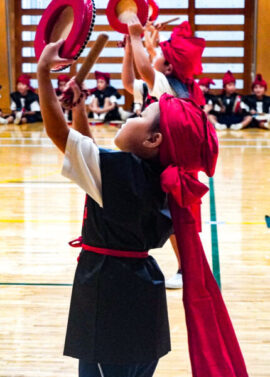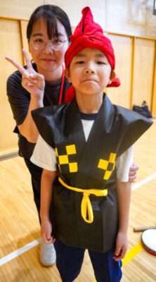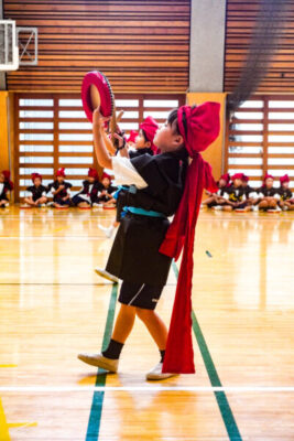 1年生は、沖縄の伝統芸能である迫力満点の「エイサー」に挑戦します。本番では、素敵な衣装を身にまとい、太鼓を持って力強く踊ります。