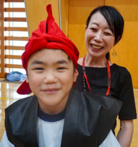 この日は、保護者の皆様にご協力いただき、本番で頭に巻く「サージ」(布)のつけ方を練習しました。小ホール(体育館)に集まった保護者の方々は、お子さん一人ひとりにサージを丁寧に巻いてくださいました。