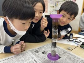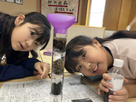 授業では、装置を使って泥水を濾過する実験に挑戦!水がきれいになる過程に、子どもたちは興味深く取り組み、驚きの声をあげていました。
