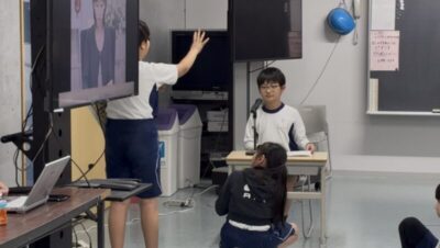 その後、各クラスの代表チームがみんなの前で実演。ニュース原稿を時間通り正確に読めた瞬間、歓声があがりました。
