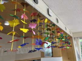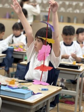 1年生の図工は「きょうしつかざり」をします。「きょうしつかざり」は、両面おりがみを折りたたんでチョキチョキ切っていきます。開いてできあがった色々な形は、ストローを間にはさんでひもを通していきます。なかなか難しい作業でしたが、完成した「きょうしつかざり」を並べてかざると、風にゆらゆら揺れて素敵な仕上がりとなっています。