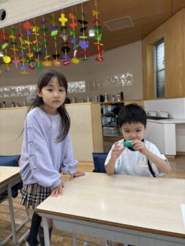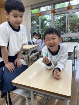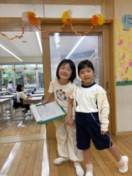 1年生と2年生が「学校探検」をしました。2年生は、1年生のために事前にリハーサルもしていました。 当日は、行く先々で2年生が優しく寄り添い声を掛けています。1年生を案内している2年生の姿が誇らしげに映りました。無事に1年生教室に戻った後は、2年生から朝顔の種のプレゼントがあります。朝顔の種は、昨年度自分たちが育て花を咲かせ収穫した種です。素敵な花が咲くといいですね。