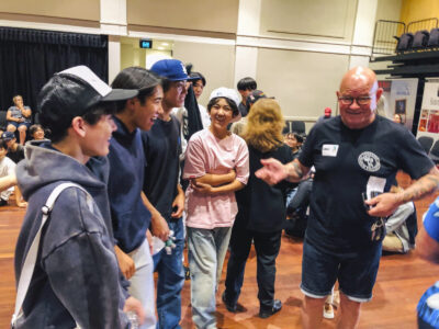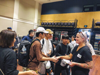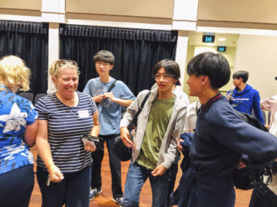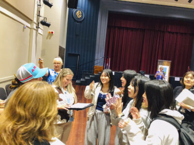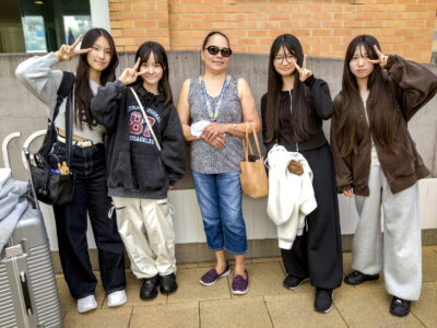 そしていよいよ、それぞれの学園生たちと担当してくださるホストファミリーの方の名前が呼ばれて、双方が初めてのご対面となります。ホストファミリーの皆さんが、それはそれはとても温かく学園生達を迎え入れてくださったので、どの生徒の顔にも笑顔があふれ、彼らの口からは自然と“Nice to meet you.” の挨拶の言葉がこぼれていました。