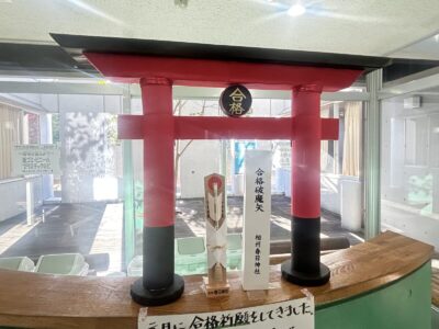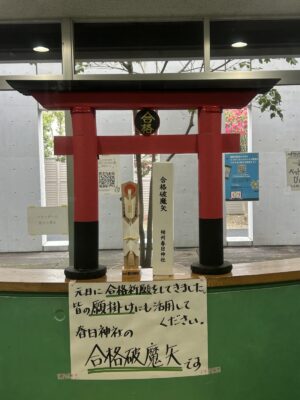 高3生は迫る共通テストに向けた最後の追い込みの時期となりました。先日、学年主任が元日の春日神社でもらってきた合格破魔矢を高校3年生のフロアに設置してみましたが、ちょっと寂しかったため、鳥居を作って飾ることにしました。作成してくれたのは同じく中学入学から学年を受け持っていた数学教員です。1月8日の登校日では、HR後にその場所で手を合わせる生徒たちもいました。聞いた話では、「ずっとスランプだったけど、手を合わせた後にスランプを脱した!」「手を合わせた後に問題を解いたら過去最高点を記録した!」といった生徒もいたようで、ご利益もあるそうです。