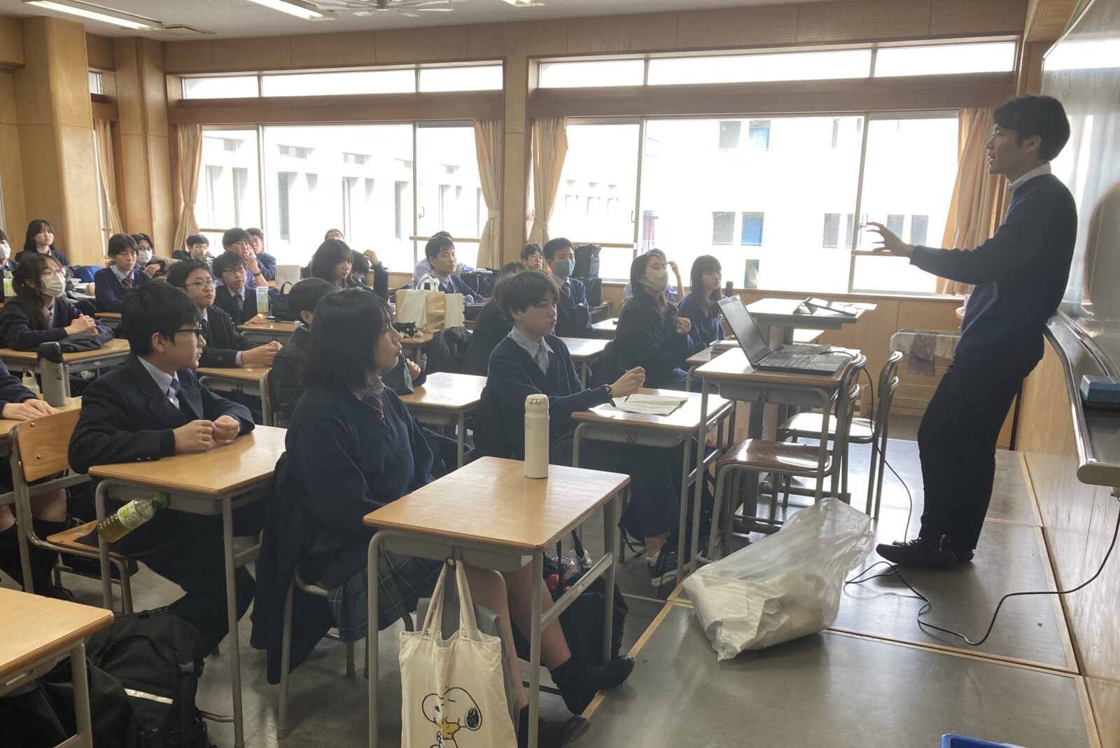 まず、各クラスにおいて担任が、「地震の基本知識」や「湘南学園の備蓄」などについて、スライドを使って説明しました。