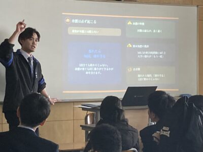 まず、各クラスにおいて担任が、「地震の基本知識」や「湘南学園の備蓄」などについて、スライドを使って説明しました。