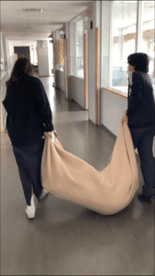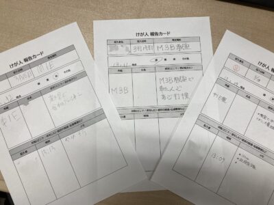その後、「封筒訓練」を実施しました。これは、封筒の中に、シュチュエーション(例えば「頭部打撲(男子)」「手首捻挫(女子)」といった内容)が書かれた紙が入っており、訓練開始と同時に封筒を開け、書かれているシュチュエーションに対応するというものです。