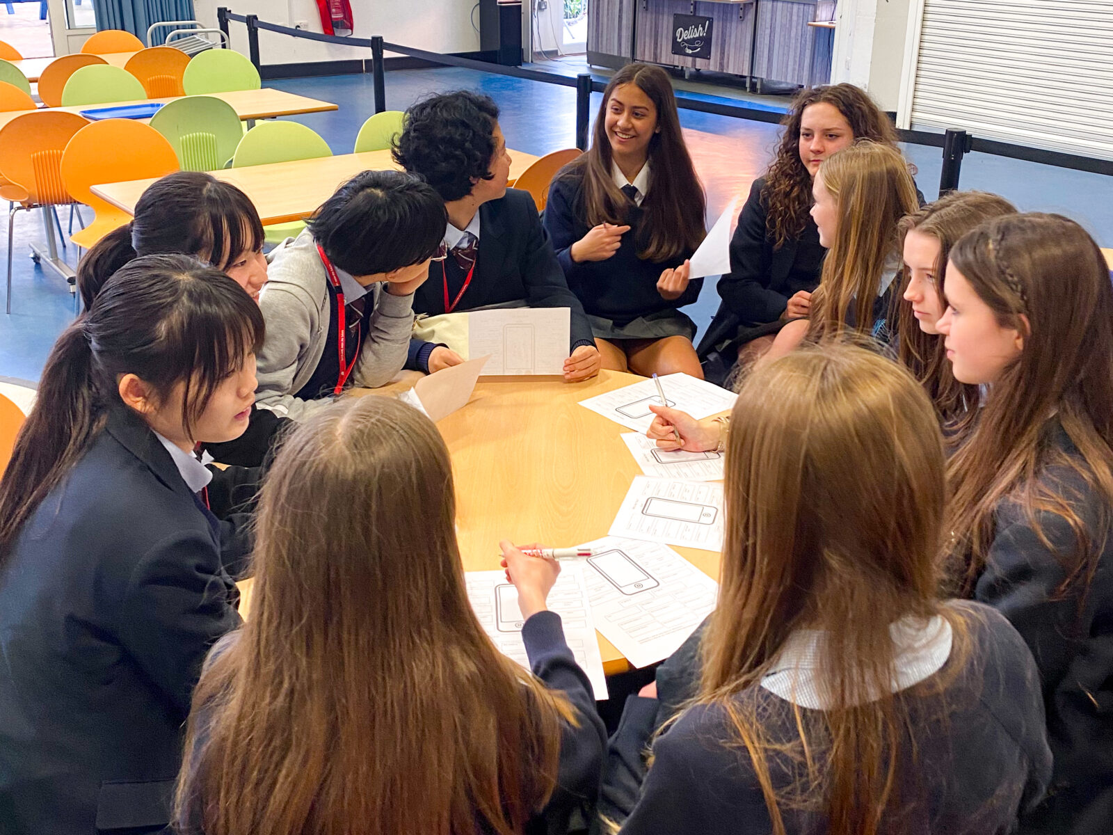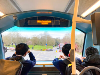 ダブルデッカー(ロンドンの赤い2階建てバス)でRedden Court Schoolに到着すると、現地の中高生が温かく歓迎してくれました。現地校訪問の初日は、Welcome Partyでお互いの自己紹介をした後に、実際に現地校の生徒と一緒にPEやArt、Design and Technologyなどの授業に参加しました。その後も、学校見学や1日2回のランチタイムなどを通じて、少しずつ関係性を深めながら、「ここに住みたい!」や「帰りたくない!」という気持ちを伝えてくれる生徒も出てきました。海外の同世代の生徒に対して、自分自身について英語で表現する機会は、「英語を話せるようになるためには英語を話さないといけない。」という英語の土台となる考え方を改めて確認させてくれました。