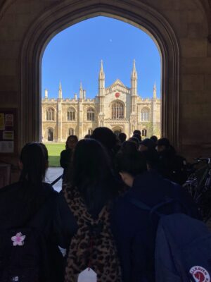 スタディーセンターからCoachで約1時間、現地に到着した生徒はケンブリッジの誇る壮大な歴史的建造物や趣のある美しい街並みに圧倒されていました。ランチタイムを含めた自由行動の後に向かったのは、31の大学を総合したケンブリッジ大学の1つでもあるPembroke Collegeです。ケンブリッジ大学は宿舎と学舎が分かれていて、学生は敷地内で生活をしながら、勉強や研究に励んでいます。多くの世界的科学者を輩出した大学の景観はまるで絵画の世界の中にいるようでした。ツアー終了後には、ケンブリッジ大学の公式ウェアなど、おみやげのためのショッピングを楽しみながら、引き続き、自分自身の英語とも向き合っていました。