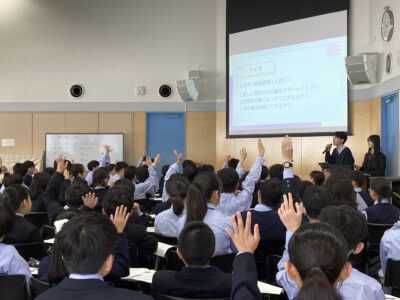 1時間目は、ホールで「中学校の勉強の仕方」・「湘南学園の行事や委員会」・「特色あるプロジェクト活動」について、高校生が自分たちの経験をもとに、その魅力やアドバイスをたっぷり話してくれました。中1生たちは、メモを取りながら先輩たちの話に耳を傾け、これから始まる学校生活に期待を高めていました。