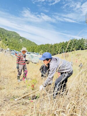 菩提峠では、コナラやミズナラ、ブナ、モミ、キハダ、サクラ、モミジカエデなど、数種類の苗木を1人5〜6本、鎌を使って草を刈り、土を掘って、しっかりと植え付けていきました。