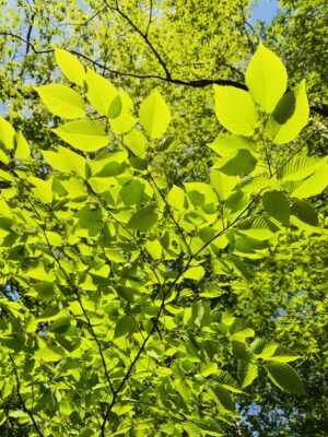 場所は、図書室からもよく見える丹沢山地・菩提峠。まずはバスでヤビツ峠まで入り、そこから自然観察のスペシャリストをガイドに、2時間ほどハイキングをしながらの自然観察。水源の森は今どうなっているのか…針葉樹の森と広葉樹の森の違いを感じながら、生き物たちの痕跡も探しながら、眩しい新緑の中をずんずん登っていきました。